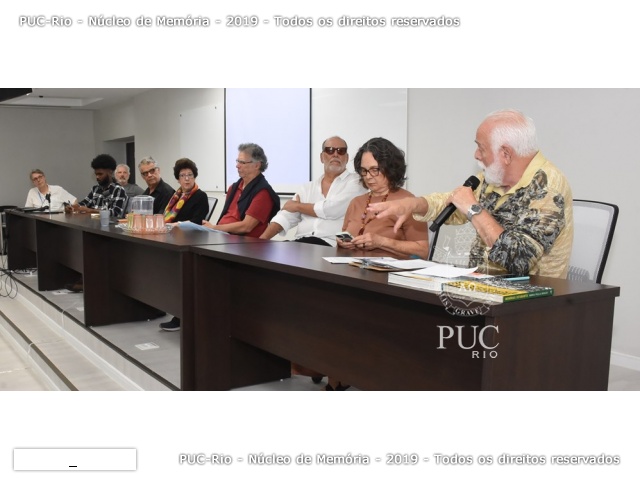 Seminário com Brendo Brazilio (ex-presidente do DCE da PUC-Rio), Bebeto Abrantes (roteirista), prof. Bebeto Tornagui (EDU), engenheiro Carlos Wagner, Juarez Precioso (diretor de cinema), prof. Marcelo Jasmin (HIS), Orlando Guilhon (Fórum Nacional pela Democratização da Comunicação), profa. Regina Abreu (UNIRIO) e a cientista social Silvia Ramos.