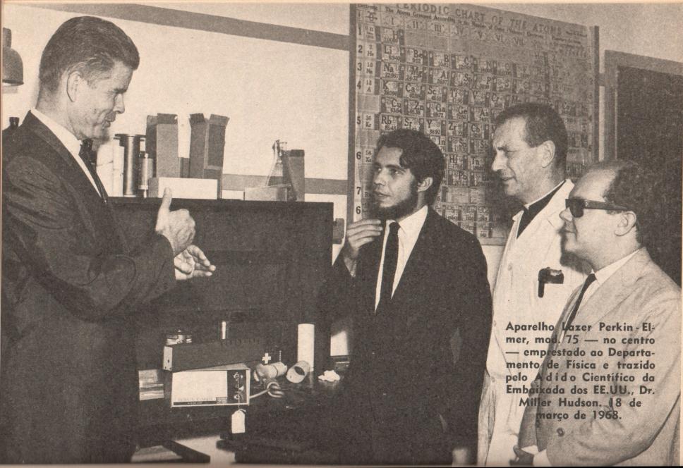 Aparelho Laser Perkin, modelo 75 da Elmer, ao centro, emprestado ao Departamento de Física e trazido pelo adido científico da embaixada dos Estados Unidos, Miller Hudson em 18 de março de 1968.