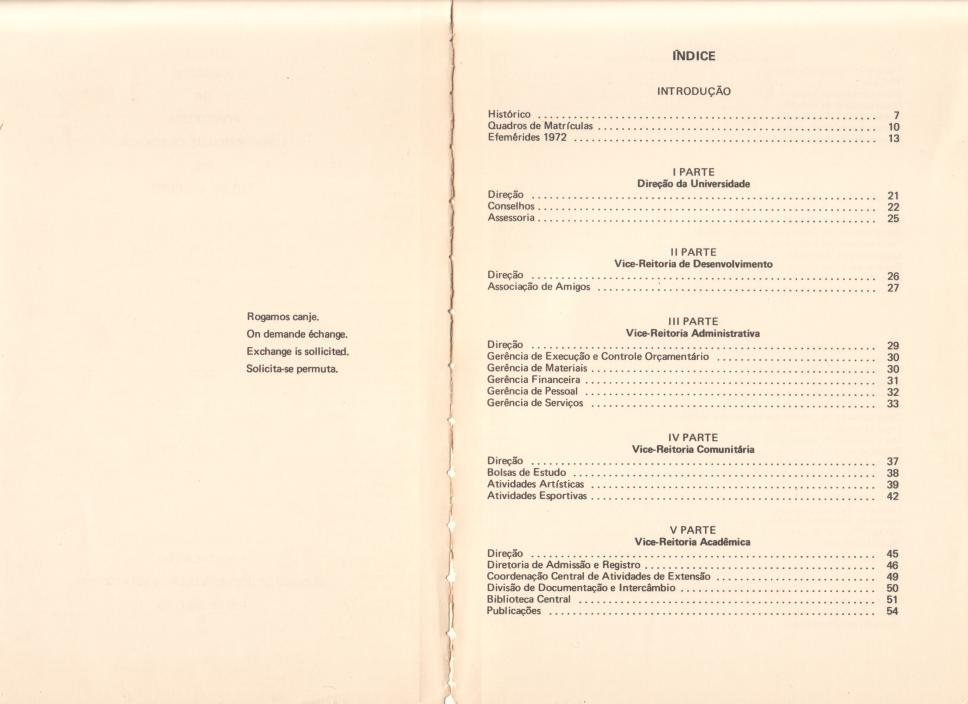 Índice do Anuário da PUC-Rio de 1972 com a indicação do histórico e da direção da Universidade e a estrutura das vice-reitorias de Desenvolvimento, Administrativa, Comunitária e Acadêmica.