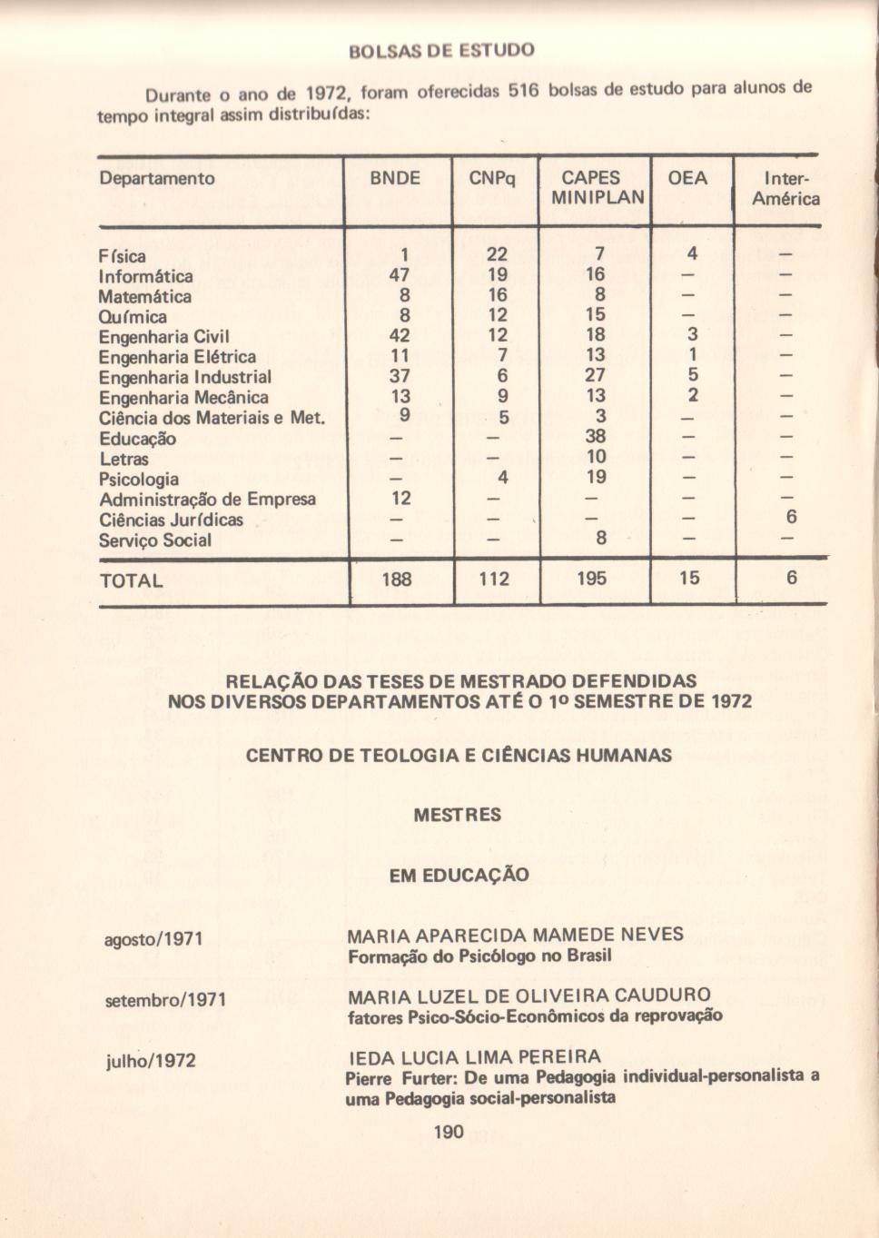Bolsas de estudo e relação das teses de Mestrado defendidas in Anuário PUC-Rio 1972