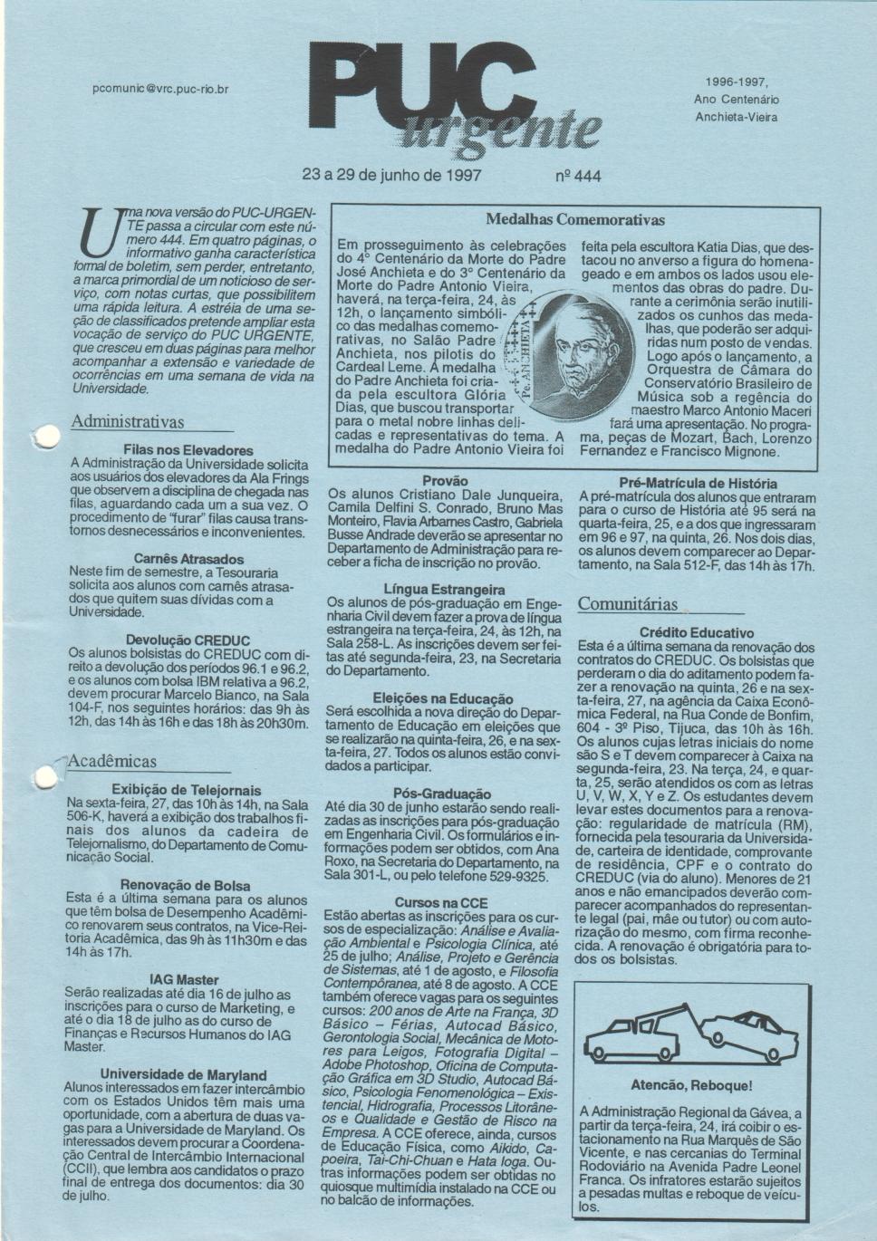 Primeira página do PUC Urgente número 444 de 23 a 29/06/1997. Lançamento de medalhas comemorativas do 4o. centenário da morte do Pe. José de Anchieta e do 3o. centenário da morte do Pe. Antonio Vieira.