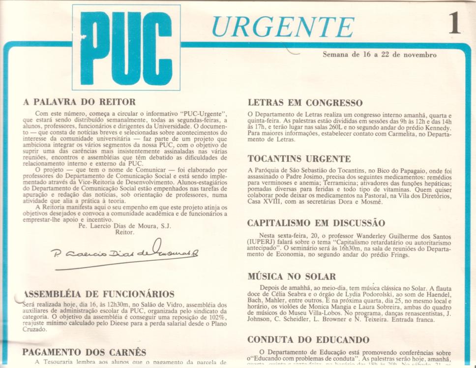 Edição número 1 do PUC Urgente de 16 a 22 de novembro de 1987. A primeira página traz um texto de divulgação da publicação do reitor pe. Laércio Dias de Moura S.J.