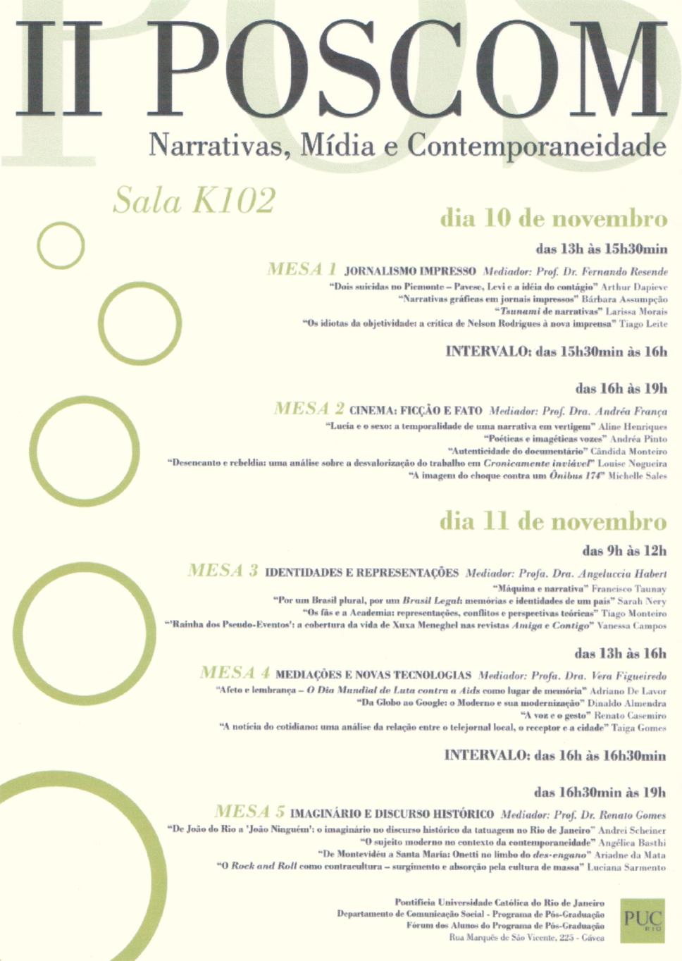 Folder do II POSCOM - Seminário dos alunos do Programa de Pós-Graduação em Comunicação Social da PUC-Rio - realizado entre os dias 10 e 11 de novembro de 2005 na sala K102.