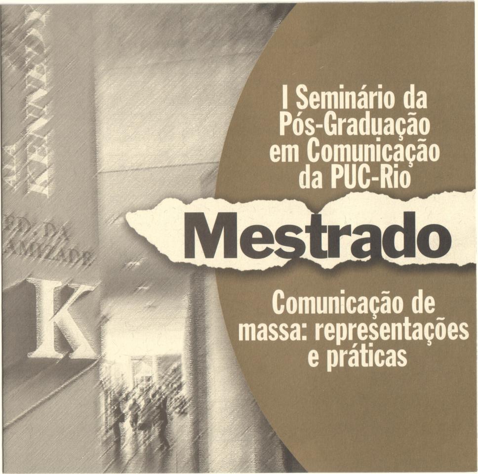 Folder do I Seminário da Pós-Graduação em Comunicação da PUC-Rio intitulado "Comunicação de massa: representações e práticas", realizado no Auditório Pe. Anchieta entre os dias 19, 20 e 21 de maio de 2003.