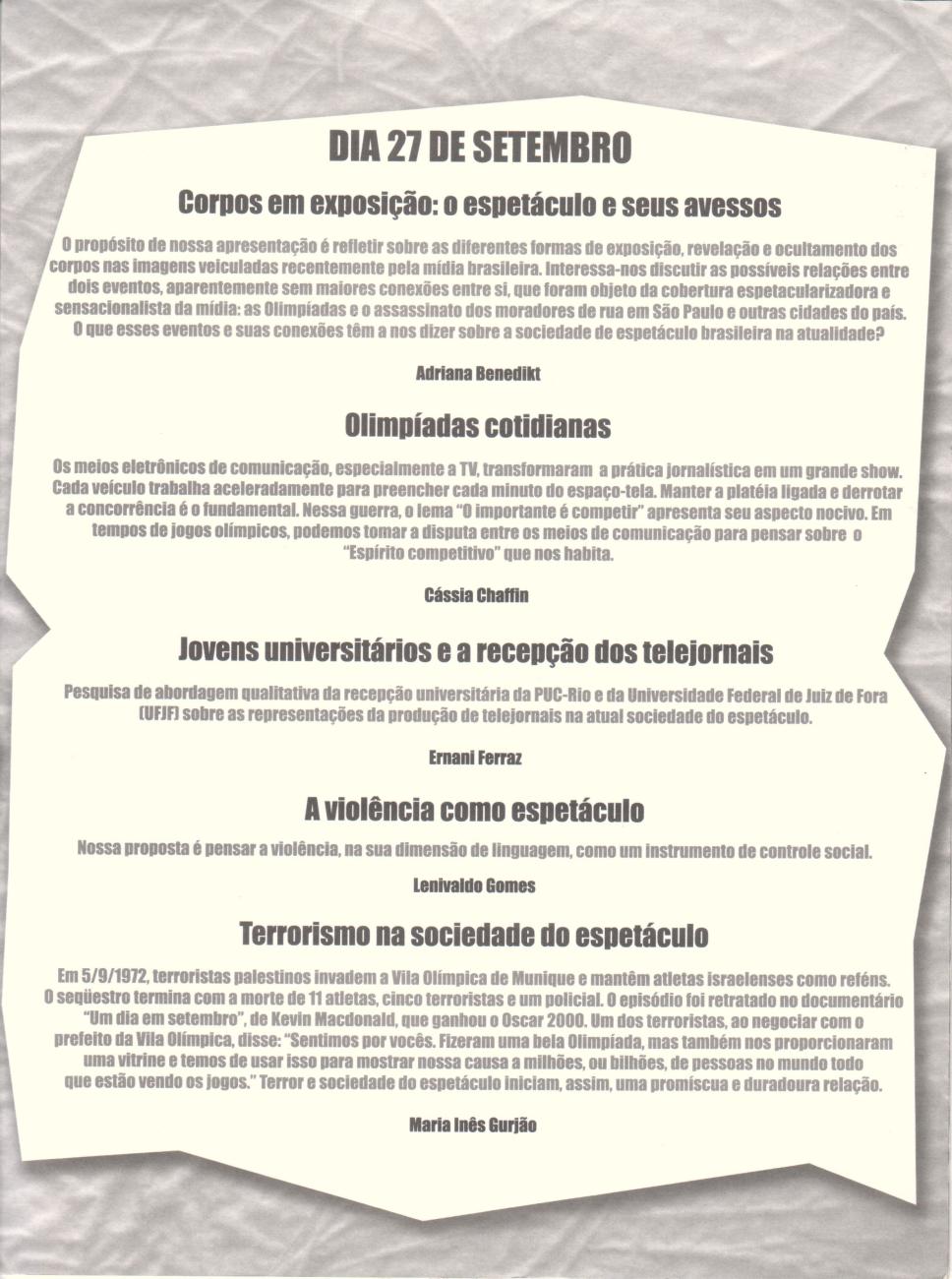 Programação do dia 27 de setembro do VII Ciclo de Reflexões em Comunicação intitulado "Sociedade do Espetáculo: mídia e imaginário contemporâneo" realizado no Auditório Pe. Anchieta.