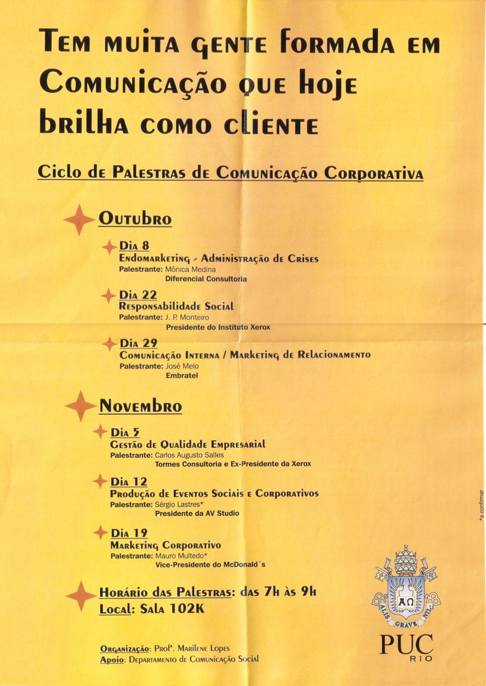 Folder do Ciclo de palestras de Comunicação Corporativa intitulado "Tem muita gente formada em Comunicação que hoje brilha como cliente", organizado pela Profa. Marilene Lopes, realizado nos dias 08, 22 e 29 de outubro e 05, 12 e 19 de novembro na sala K102.