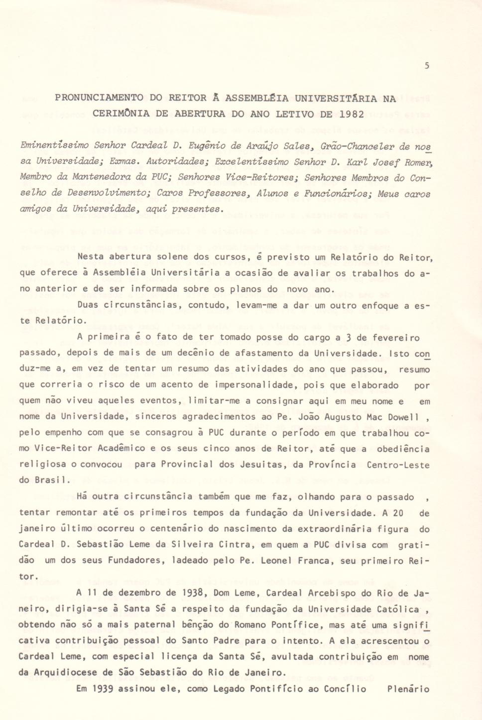 Pronunciamento do Reitor Padre Laércio Dias de Moura S.J. à Assembleia Universitária na cerimônia de abertura do ano letivo de 1982. Balanço de atividades, tendo ele voltado à PUC-Rio após 10 anos de afastamento. Comenta o centenário de Dom Sebastião Leme.