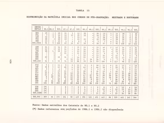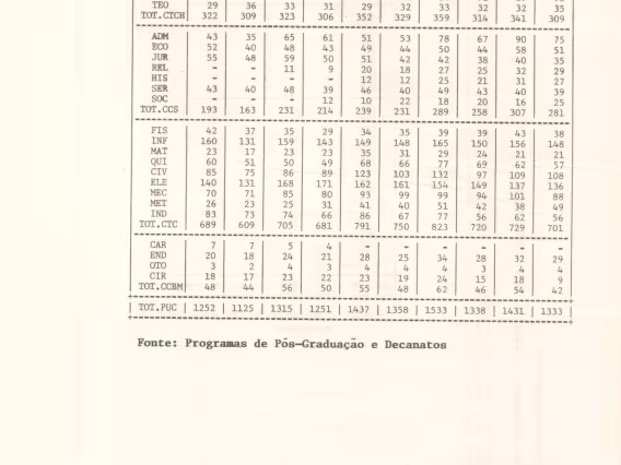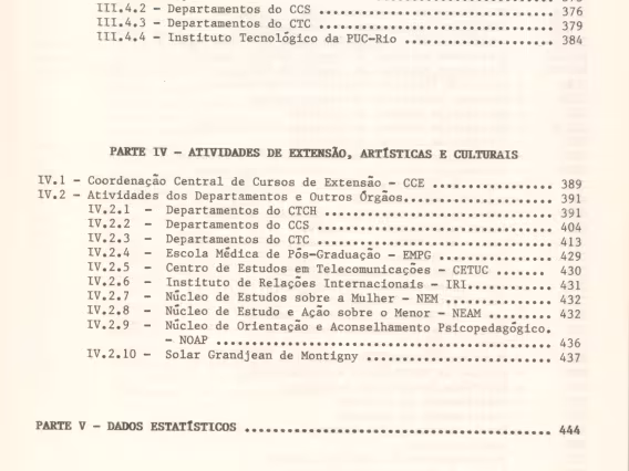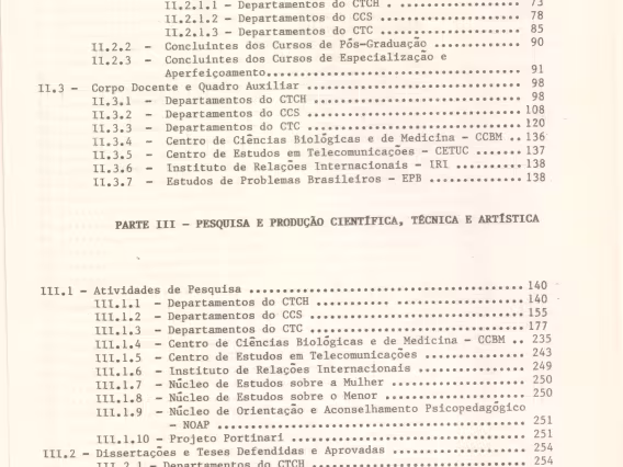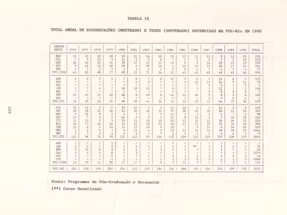 Balanço do ano de 1990 da PUC. Anuário não mais apresentado por Departamentos e sim por matérias. Apresenta o relato de atividades dos membros da Universidade, como das Vice-Reitorias, da Reitoria e dos Centros. Lista as atividades do corpo docente da Universidade, a quantidade de alunos concluintes por Departamento, a relação dos professores, as linhas de pesquisa, as produções científicas, as publicações dos professores no Brasil e no exterior, as publicações periódicas e teses defendidas. O Anuário apresenta também uma série de tabelas, como das teses defendidas e da distribuição da matrícula nos cursos de pós-graduação.