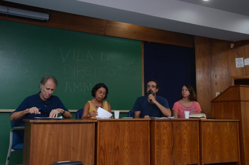 Assembleia sobre a refundação da Associação dos Docentes da PUC-Rio (ADPUC). Na mesa, professores representantes de alguns cursos estavam presentes, como professores João Ricardo Wanderley Dornelles, do Departamento de Direito, Mônica Frota, do Departamento de Artes & Design, Henrique Estrada Rodrigues, do Departamento de História, e a professora Alessandra Maia, do Departamento de Ciências Sociais.
