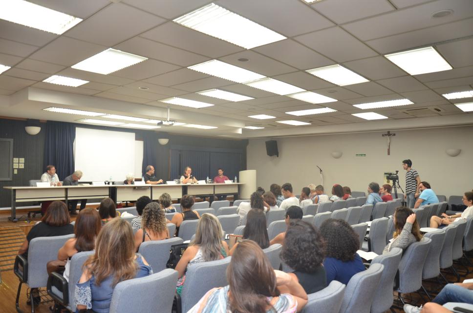 Lançamento do livro Correspondência Mário de Andrade & Alceu Amoroso Lima, promovido pela Editora PUC-Rio e pelo Decanato do CTCH. Os participantes da bancada são o membro decano do CTCH, Júlio César Diniz; o professor do Departamento de Filosofia, Eduardo Jardim; a professora do departamento de Letras Marília Rothier Cardoso; o organizador do evento, Leandro Garcia Rodrigues; a professora do Departamento de Teologia Maria Clara Bingemer e Felipe Gomberg, membro da Editora PUC-Rio.