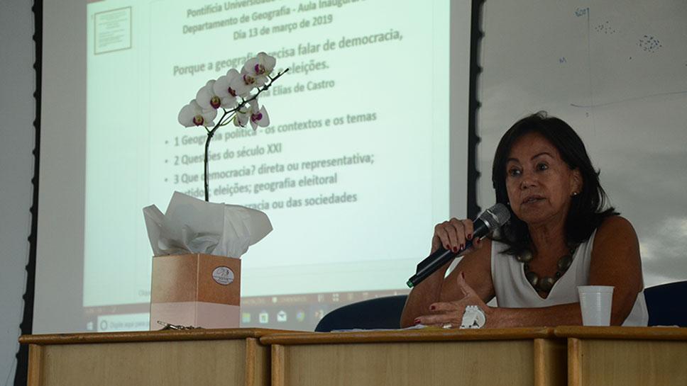 Professora Iná Elias de Castro, titular do departamento de Geografia da UFRJ, na aula inaugural de geografia com o tema: Porque a Geografia Precisa Falar de Democracia, Partidos e Eleições.