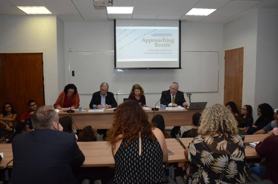 mesa-redonda “Approaching Brexit: protecting a peace process and preparing for the day after”. O evento foi promovido pelo Instituto de Relações Internacionais da PUC e a Unidade do Sul Global para Mediação (GSUM), em parceria com CEBRI - Centro Brasileiro de Relações Internacionais e a Embaixada da Irlanda no Brasil.