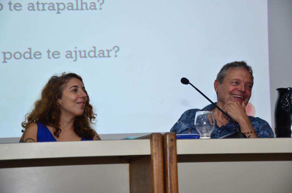 A professora de Língua e Cultura Italiana, Miriam Di Domenico e o convidado internacional Alexander Lommatzsch na palestra Psicoterapia Gestalt e o trabalho com as emoções.