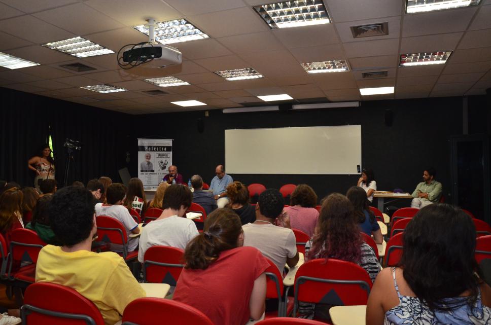 Da direita para a esquerda: O jornalistas Aziz Ahmed e autor do livro “Memórias da Imprensa Escrita”; jornalista Bruno Thys, ex-editor do Globo e do Jornal do Brasil, os professores Luciana Brafman e Alexandre Carauta na palestra sobre memórias da imprensa escrita.
