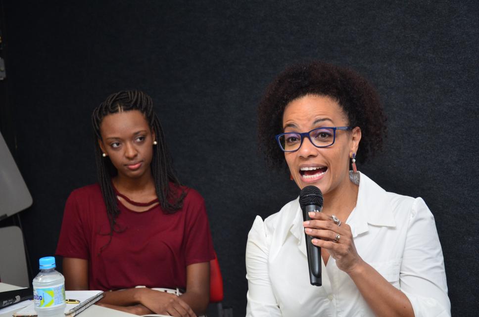 A mediadora da mesa Gabriele Rosa e a comentarista da CBN e do Estúdio I, Globo News e colunista do Jornal O Globo, Flávia Oliveira em palestra promovida pelo Departamento de Comunicação.