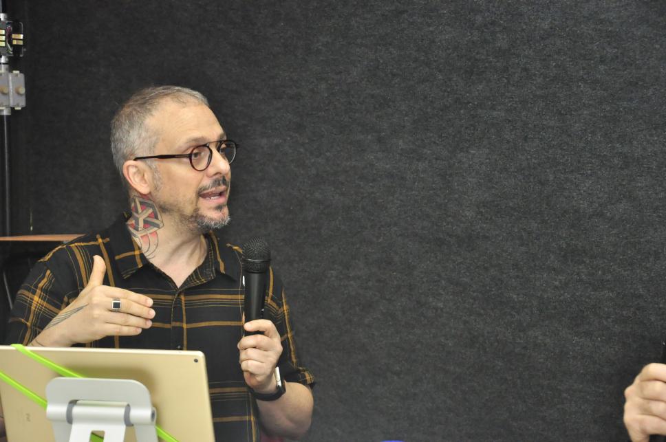 O professor Sergio Mota, do Departamento de Comunicação mediando o bate-papo com Oskar Metsavaht, fundador e diretor de criação e estilo da Osklen e presidente do Instituto - e.