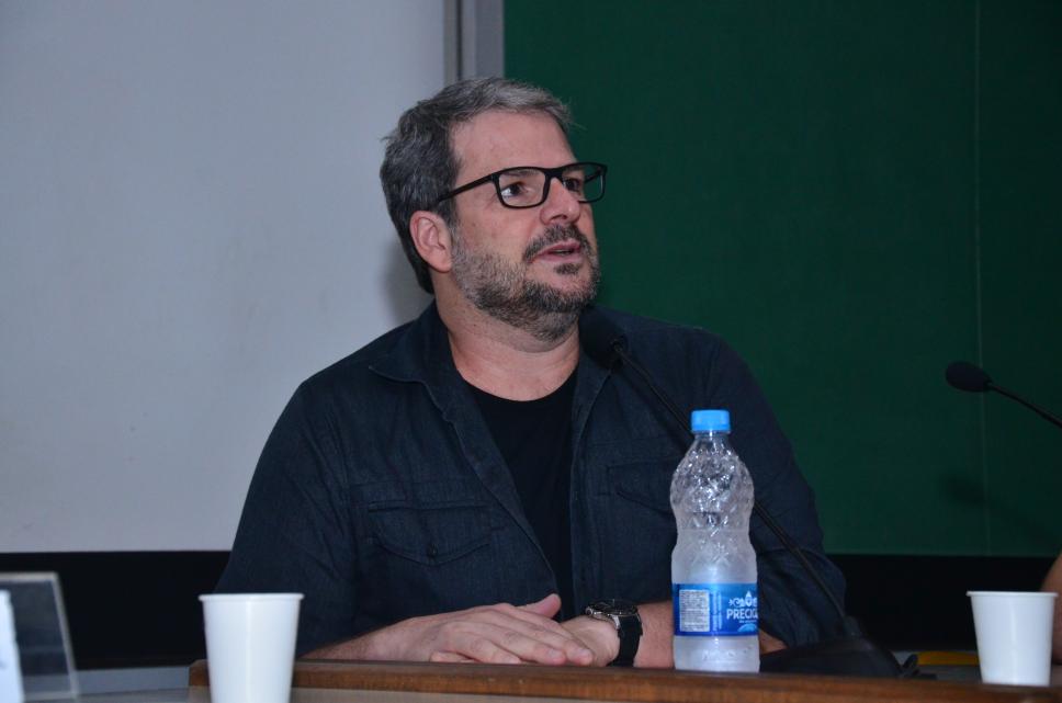 O professor Marcelo Motta de Freitas, do Departamento de Geografia, na palestra sobre chuvas na cidade do Rio de Janeiro.