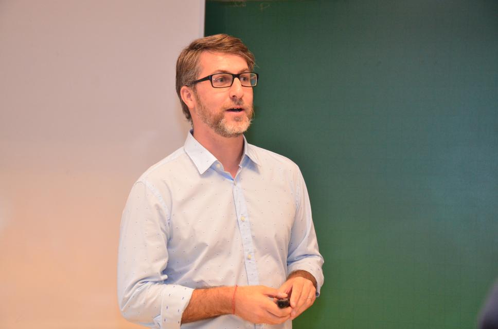 O professor Claudio Abramovay Ferraz do Amaral, do Departamento de Economia, na posse como Professor Titular da PUC-Rio, ministrando a aula magistral sobre o Uso de Economia e Dados para a Avaliação de Políticas Públicas.
