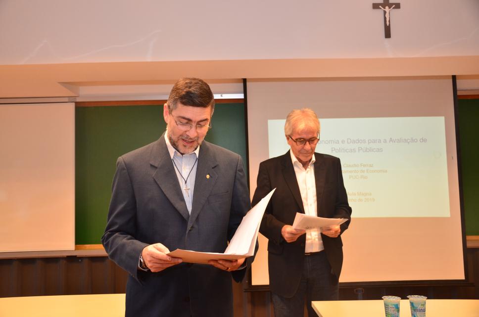 O Vice-Reitor da PUC-Rio pe. Álvaro Pimentel S.J e o Vice-Reitor para Assuntos Acadêmicos, José Ricardo Bergman, na Aula Magistral para sua titulação como Professor Titular da PUC-Rio, sobre o Uso de Economia e Dados para a Avaliação de Políticas Públicas.