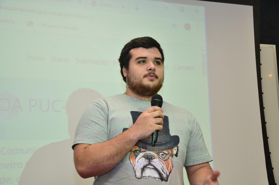 Leonardo Flores, aluno do Departamento de Comunicação Social, na premiação do desafio ECOA PUC-Rio.