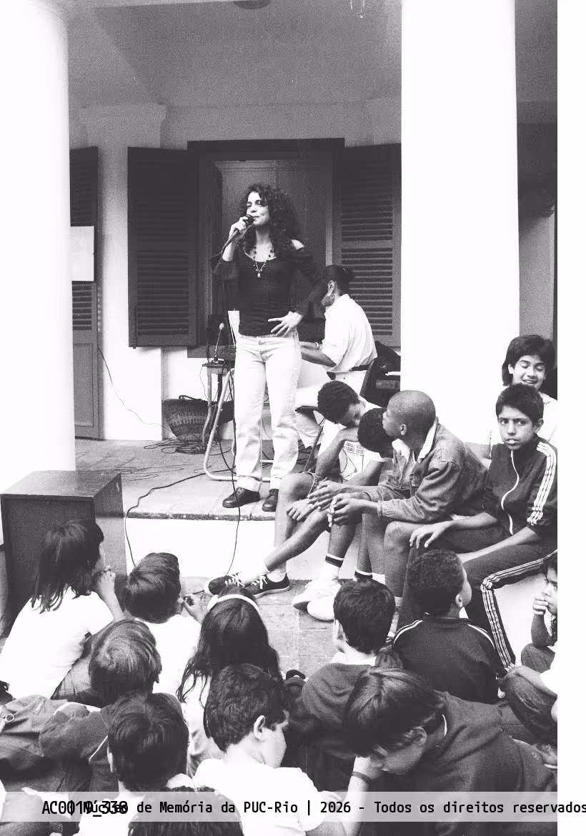 A cantora Conceição Rios cantando MPB, com crianças de outras escolas, na exposição Redescobrindo o Mundo, promovida pelo Solar Grandjean de Montigny em 1992.
