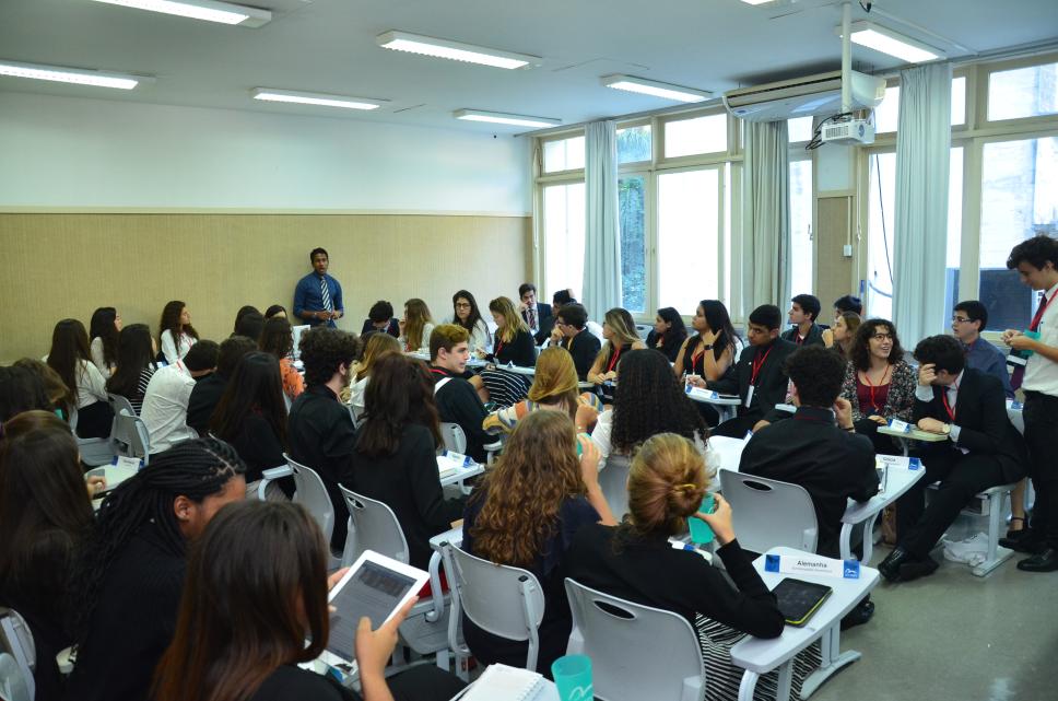 Estudantes do Ensino Médio, organizadores e alunos da PUC em simulações da ONU no XVI Modelo Intercolegial de Relações Internacionais.