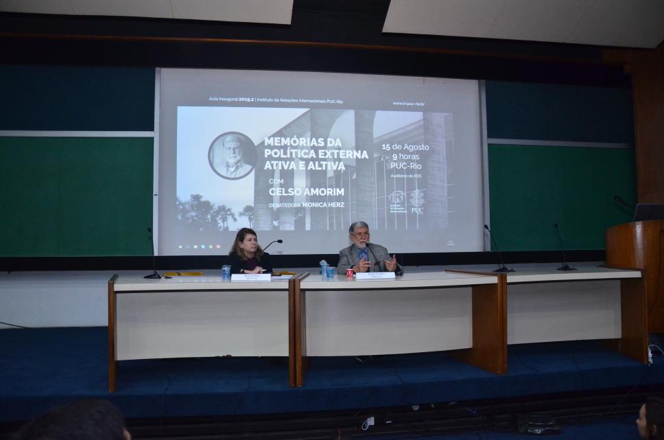 O palestrante convidado Celso Amorim, diplomata que ocupou o cargo de ministro das Relações Exteriores nos anos de 1993 a 1995 e, de 2003 a 2011 e chefiou o Ministério da Defesa, no período de 2011 a 2015, e a professora mediadora Monica Herz.