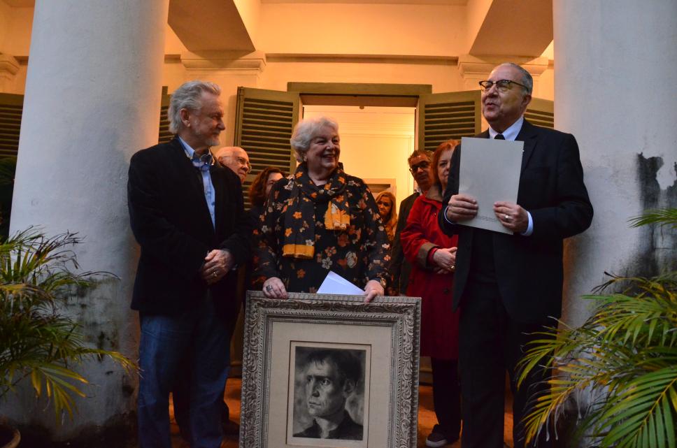 O professor e escritor brasileiro João Cândido Portinari, o fundador e diretor-geral do Projeto Portinari, filho do Candido Portinari, a professora Margarida de Souza Neves, coordenadora do Núcleo de Memória da PUC-Rio e o reitor da PUC, padre Josafá Carlos de Siqueira S.J na abertura da exposição Uma carta aos brasileiros, no Solar Grandjean.