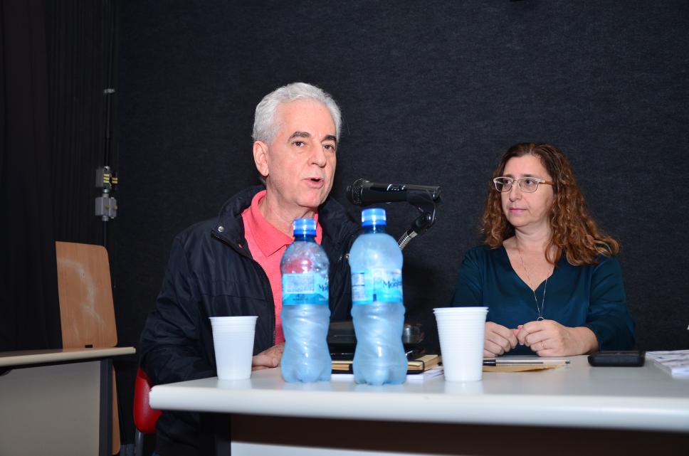 O diretor do Departamento de Comunicação Social, professor Leonel Aguiar e a professora Patrícia Maurício Carvalho, uma das coordenadoras-adjuntas de graduação, no lançamento da cartilha Desinformação: Ameaça ao direito à comunicação muito além das fake news, do autor Bruno Marinoni.
