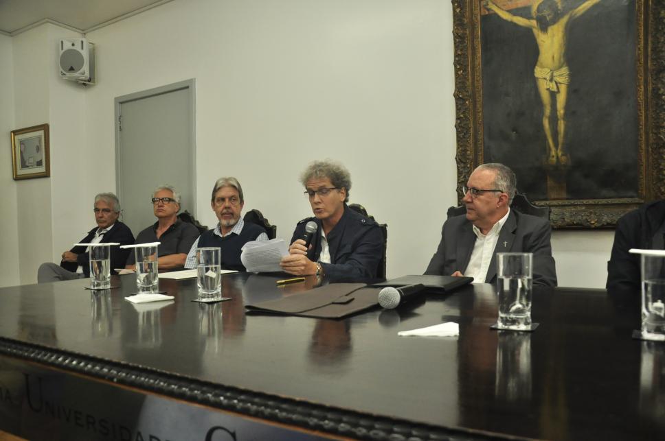 O prof. José Ricardo Bergmann, Vice-Reitor Acadêmico; o prof. Sérgio de Almeida Bruni, Vice-Reitor de Desenvolvimento; o prof. Ricardo Tanscheit, do Departamento de Energia Elétrica; o prof. Marcelo Burgos e o Reitor pe. Josafá Carlos de Siqueira S.J na posse do prof. Marcelo Burgos como novo diretor do Departamento de Ciências Sociais.