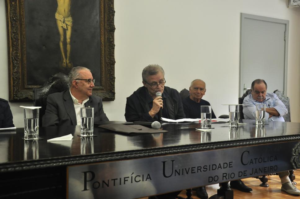 O padre Josafá Carlos de Siqueira S.J, reitor da faculdade; o professor Ricardo Emmanuel Ismael de Carvalho, do Departamento de Ciênciais Sociais; o professor Augusto Sampaio, Vice Reitor Comunitário e o professor Luiz Roberto Azevedo Cunha, decano do CCS na posse do professor Marcelo Burgos como novo diretor do Departamento de Ciências Sociais.