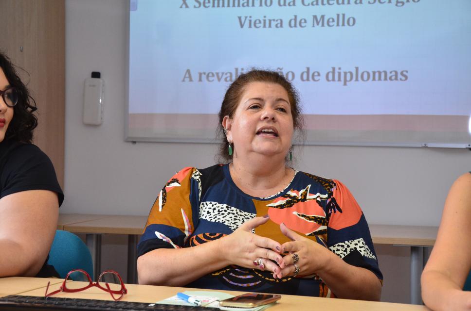 A professora Ângela Vasconcelos, da Universidade Federal Fluminense (UFF), em palestra sobre a reavaliação do diplome no X Seminário Nacional da Cátedra Sérgio Vieira de Mello (CSVM).