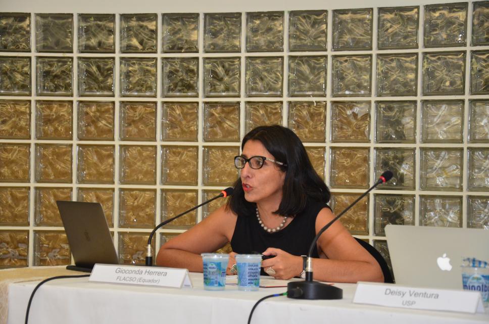 A profa. Gioconda Herrera (FLACSO-Equador) em palestra sobre Populações migrantes em situação de vulnerabilidade: Proteção, Acolhimento e Integração Local.