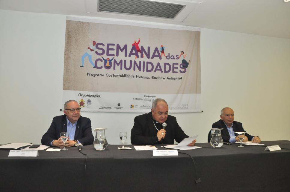O Reitor da Universidade, pe Josafá Carlos de Siqueira S.J, o Arcebispo do Rio de Janeiro, Dom Orani João Tempesta e o Vice-reitor Comunitário, prof. Augusto Sampaio na abertura da Semana das Comunidades.