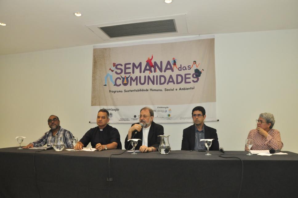 O professor Antonio Carlos de Oliveira, do Departamento de Serviço Social; o diretor do Departamento de Teologia, padre Waldecir Gonzaga, Monsenhor Manoel de Oliveira; o coordenador da Pastoral Universitária Anchieta, padre José Abel de Souza S.J e a assessora da vice reitoria comunitária e integrante da Comissão de Trabalho do Programa Sustentabilidade Humana, Social e Ambiental, Andreia Paiva na mesa sobre Compromisso Social: o convênio entre a PUC-Rio e a Arquidiocese do Rio de Janeiro para a expansão Comunitária, na Semana das Comunidades.