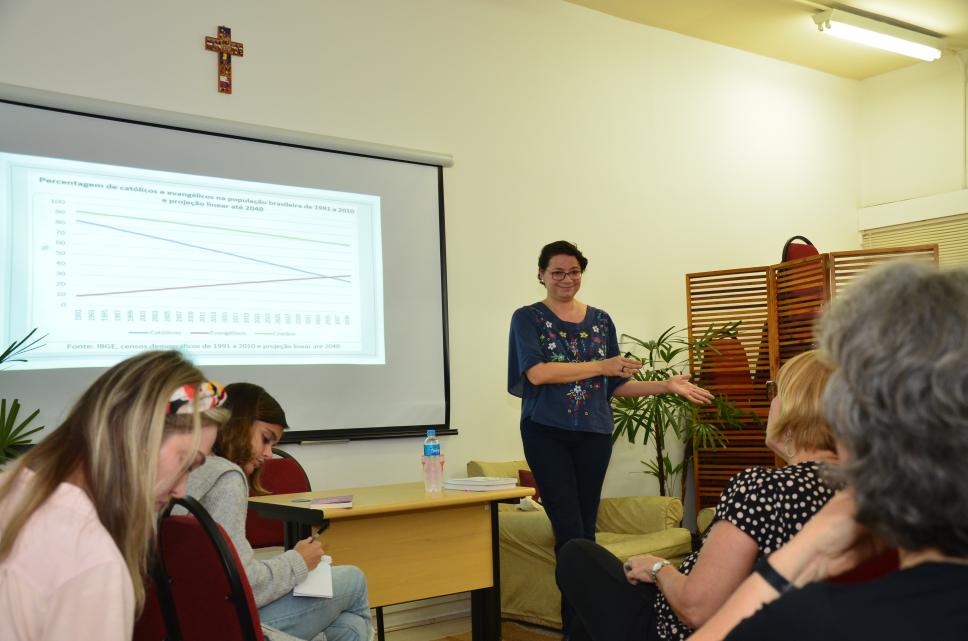 A professora Francilaide Ronsi, do Departamento de Teologia, na palestra sobre o panorama religioso da atualidade.