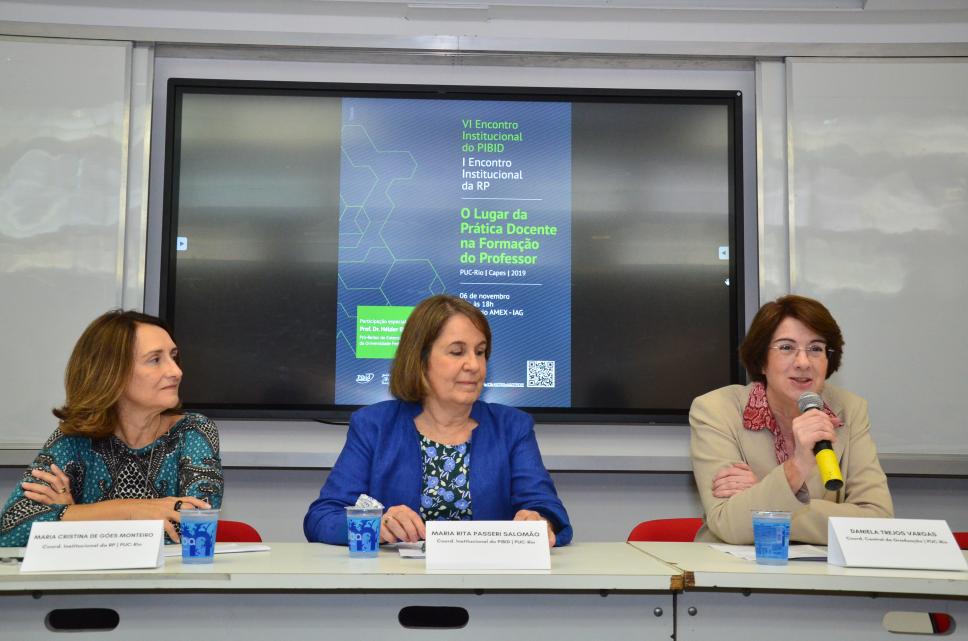 A Coordenadora Institucional do Programa de Residência Pedagógica da PUC-Rio, profa. Maria Cristina de Góes Monteiro, a Coordenadora Institucional do PIBID, profa. Maria Rita Passeri Salomão, e a Coordenadora Central de Graduação, profa. Daniela Vargas, participam do VI Encontro Institucional do PIBID e do I Encontro do Programa de Residência Pedagógica.