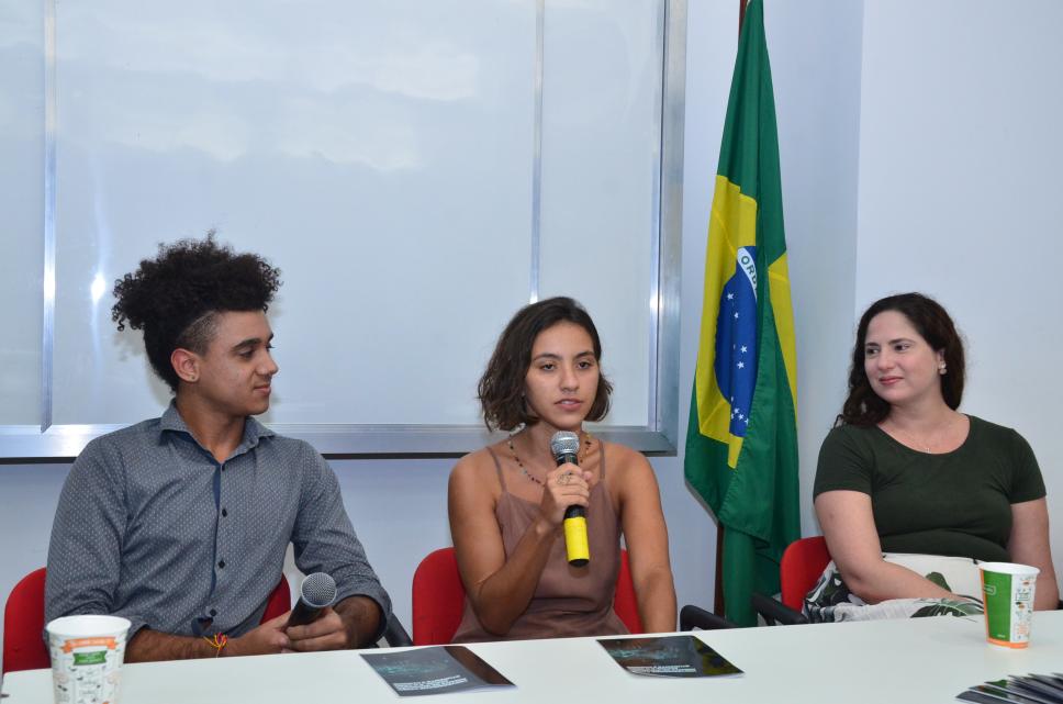 Da esq. para dir.: aluno Edson Henriques (PSI), aluna Marina Mahfuz (COM) e a doutoranda Mariana Brunelli (ADM).