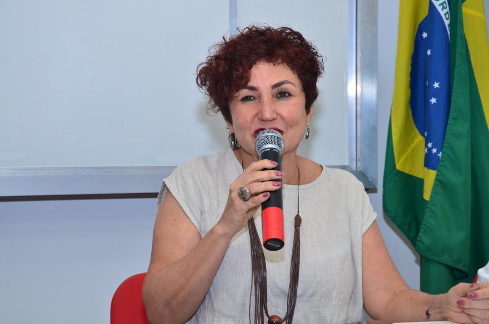 A profa. Nilza Rogéria no lançamento do livro digital promovido pelo Programa Erasmus. A publicação recolhe o relato de alunos que representaram a Universidade no projeto Students 4 Change, do programa Erasmus Plus, na Colômbia.