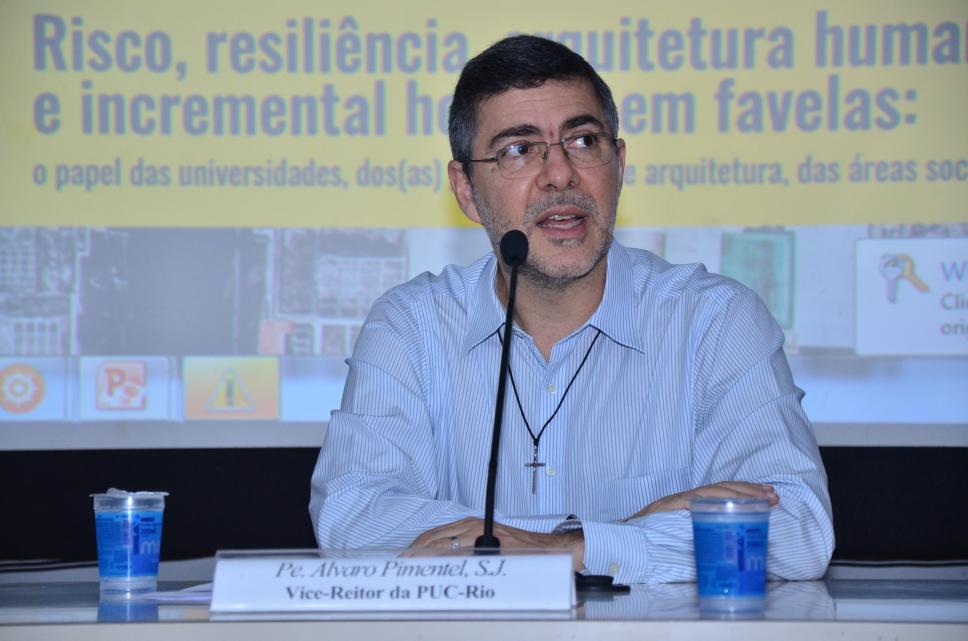 O padre Álvaro Pimentel S.J., Vice-Reitor da PUC-Rio, em palestra no seminário Risco, resiliência, arquitetura humanitária e incremental housing em favelas: o papel das universidades, dos(as) profissionais de arquitetura, das áreas sociais e das Marias & Marielles.