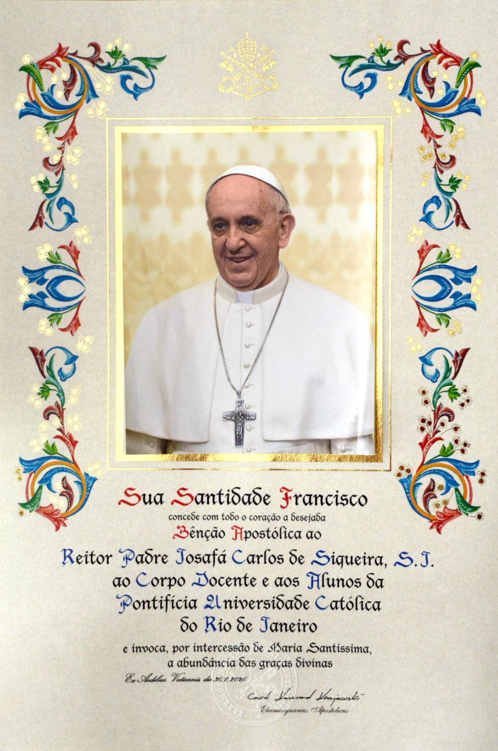 Documento da Bênção Apostólica concedida pelo Papa Francisco ao "Reitor Padre Josafá Carlos de Siqueira, S.J., ao Corpo Docente e aos Alunos da Pontifícia Universidade Católica do Rio de Janeiro e invoca, por intercessão de Maria Santíssima, a abundância das graças divinas". A Bênção é assinada pelo assessor papal cardeal Konrad Krajewski.