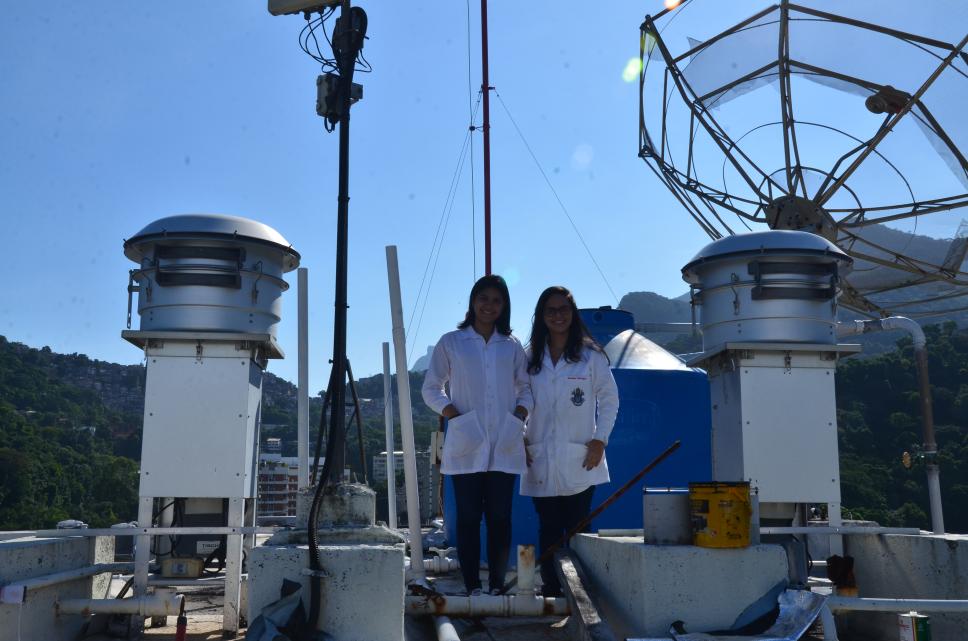 As doutorandas do Departamento de Química, Elizanne Justo e Karmel Beringui, analisam a qualidade do ar do campus Gávea da PUC-Rio.