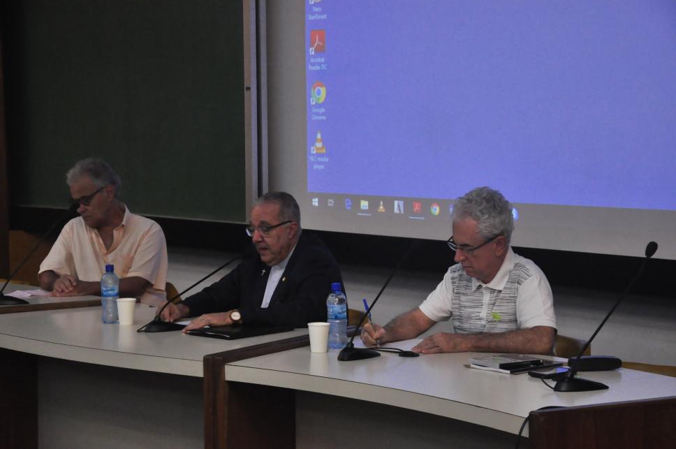 Professor Ney Costa Santos do Departamento de Comunicação Social, o reitor da PUC-Rio, padre Josafá e o diretor do Departamento de Comunicação Social, o professor Leonel Azevedo na homenagem ao professor Miguel.