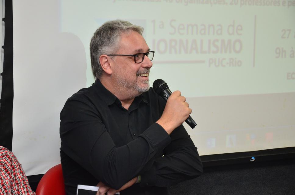 José Roberto de Toledo, Editor na revista piauí, apresentador do podcast Foro de Teresina e ex-presidente da Abraji, na primeira palestra sobre os desafios do jornalismo brasileiro da 1º Semana de Jornalismo.