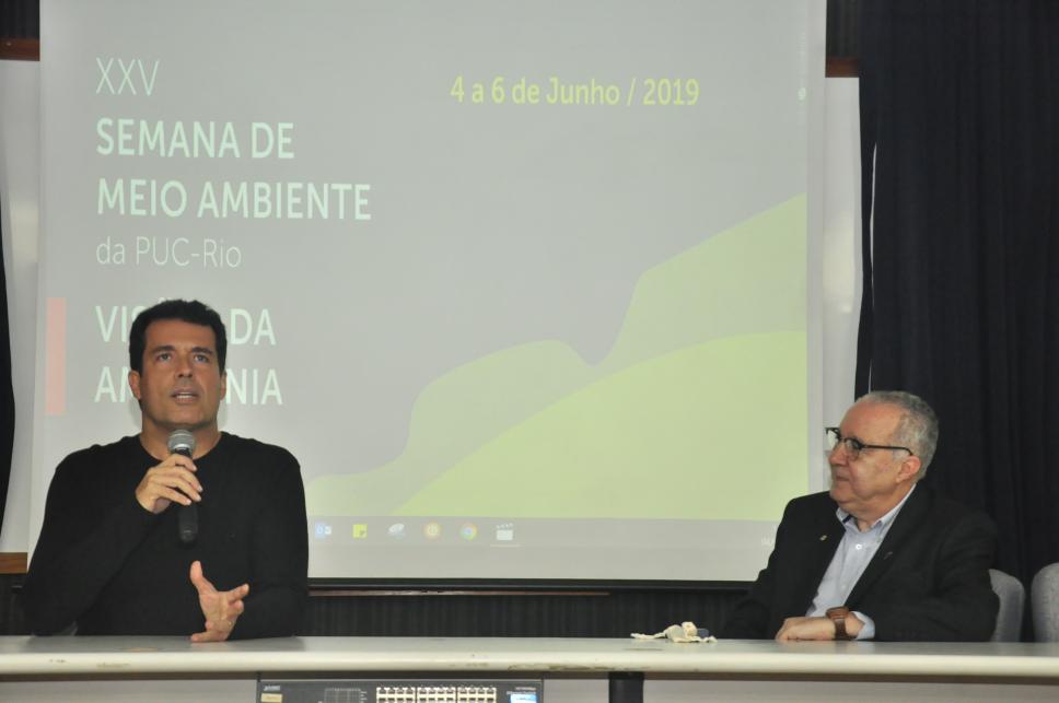 O professor André Trigueiro, do Departamento de Comunicação Social e o reitor da Universidade Padre Josafá Siqueira S.J. na palestra sobre o panorama ambiental no Brasil.