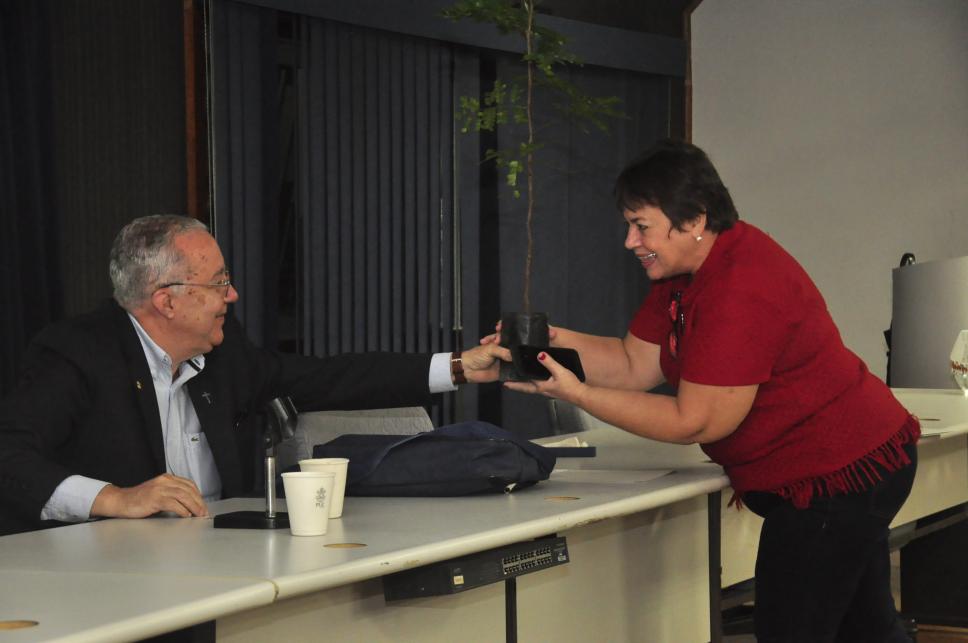 O reitor da faculdade Padre Josafá Siqueira na Abertura da XXV Semana do Meio Ambiente, recebendo uma muda de planta.
