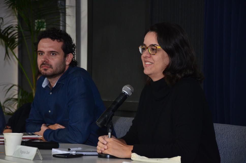 O palestrante, Luiz Felipe Lacerda, da UNICAP e Virgínia Totti, do Departamento de Direito PUC-Rio e NIMA PUC-Rio.