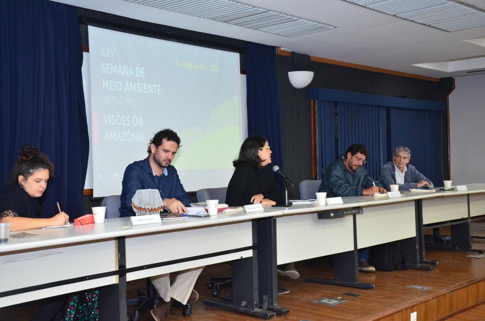 Da esquerda para a direita: Raphaela Lopes, do Laboratório de Direitos Humanos da UFRJ e advogada da ONG Justiça Global; O palestrante, Luiz Felipe Lacerda, da UNICAP e do Observatório Nacional de Justiça Socioambiental Luciano Mendes de Almeida - OLMA; Virgínia Totti, do Departamento de Direito PUC-Rio e NIMA PUC-Rio, como moderadora; Haroldo de Souza, da Faculdade de Educação do Campo da Universidade Federal do Sul e Sudeste do Pará e Fernando Walcacer do Departamento de Direito PUC-Rio e do NIMA-Jur, e da Coordenação de Direito Ambiental no NIMA PUC-Rio na palestra sobre territórios coletivos e direitos humanos na Amazônia.