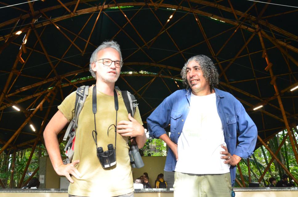 O professor, Henrique Rajão do Departamento de Biologia e o professor, Roosevelt Fidelis, gerente de Projetos Ambientais do NIMA orientando o plantio de árvore e vivência de biofilia, durante a Semana do Meio Ambiente.