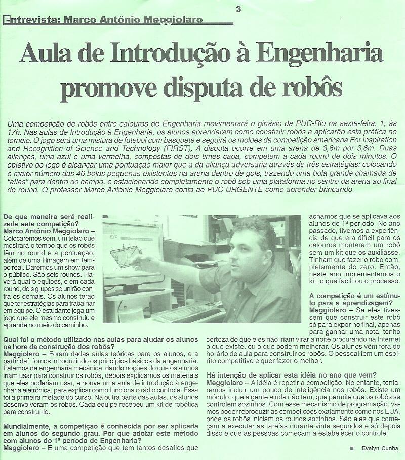 Artigo do PUC Urgente no. 880, p.3, entrevista com professor Marco Antonio Meggiolaro (MEC): "Aula de Introdução à Engenharia promove disputa de robôs".